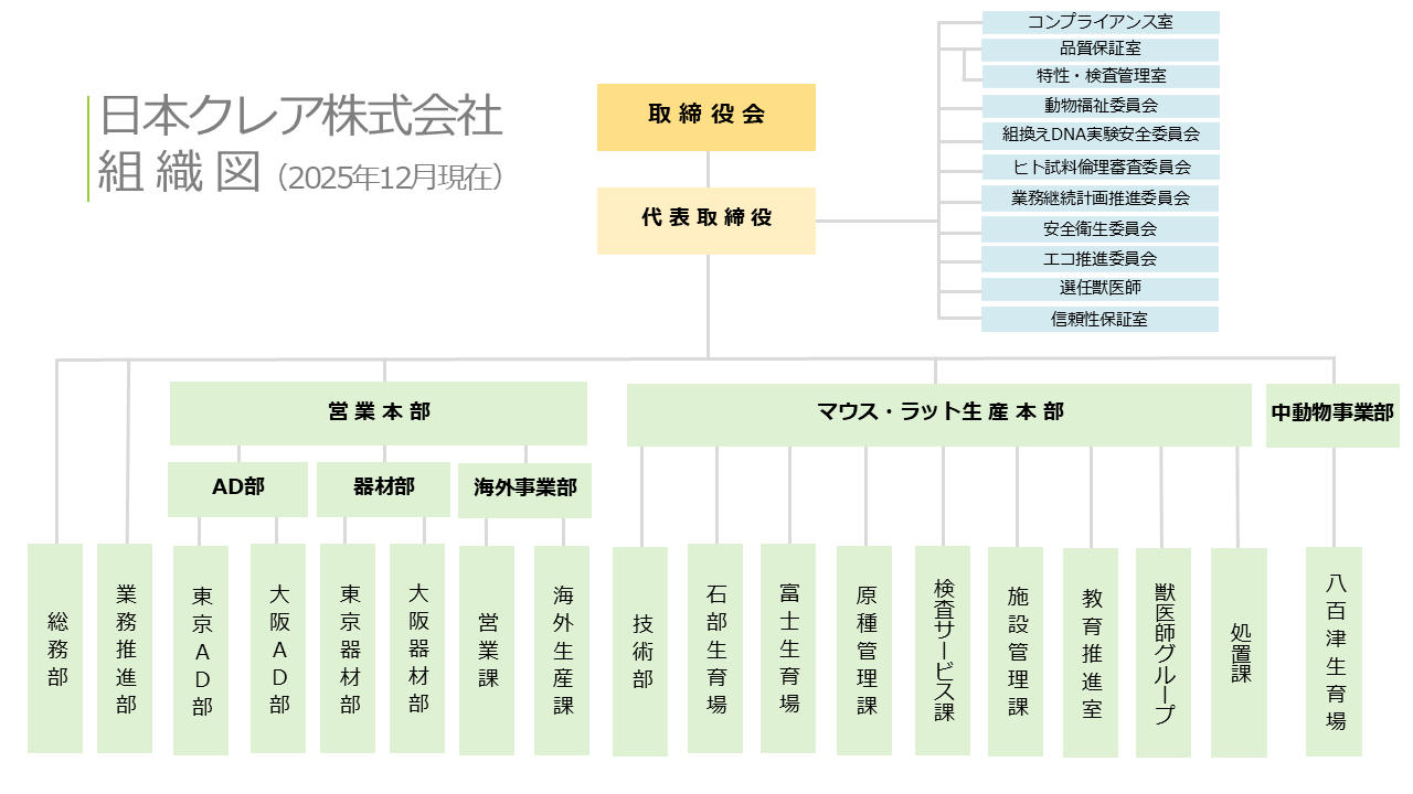 | 事業内容 | 実験動物の生産・販売 実験動物用飼料の製造・販売 実験動物飼育器具・器材・設備・装置の製造・販売 実験動物に関する受託業務(検疫・検査・受託処置・試験) 実験動物施設に関するコンサルタント並びに設計・施工・監督 実験動物飼育に関するコンサルタント並びに総合管理受託 輸出入業務 |
