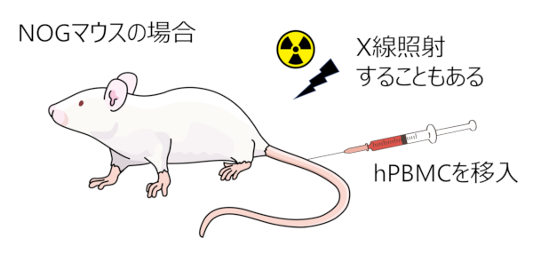 試験系によっては、X線照射で骨髄細胞を脱落させてから、hPBMCを移入することもあります。