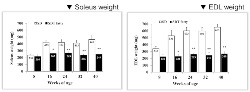 Muscle weights of the soleus and EDL were significantly lower in the SDT fatty rats than those in the SD rats from 16 weeks of age. The EDL tended to be decreased more than soleus.
